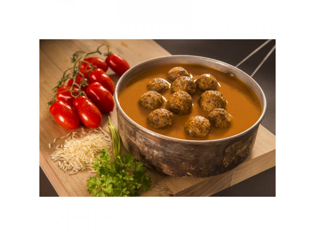 Masovo-rýžové koule z mletého hovězího masa, rýže basmati a petržele v rajské omáčce s lehkým tónem skořice. Připravit si je můžete samotné nebo například s těstovinami, čímž získáte dvě plnohodnotné porce.