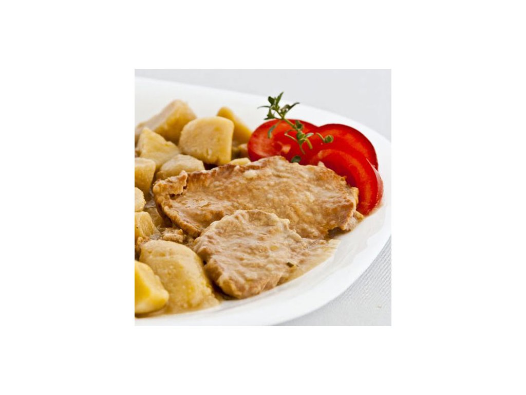 Plátek libového vepřového masa s přírodní šťávou, pro zpestření chutě je přidána domácí papriková klobása a znojemské okurky. Jako příloha jsou vařené brambory.