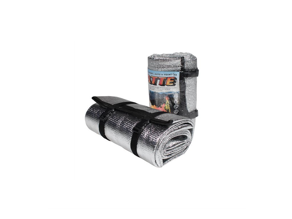 Karimatka s reflexní Alu folií. Používá se fólií nahoru, protože foile odráží zpět vyzařované teplo.