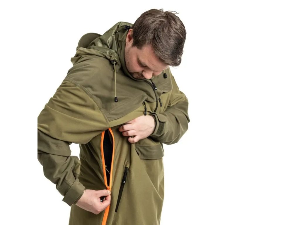 Materiál je tichý, česané mikrovlákno, které tlumí šustění – ideální pro lovecké situace nebo tichý pohyb v přírodě. Anorak má vysokou vodní sloupcovou sílu 13 000 mm a je zároveň prodyšný – udávaná prodyšnost ~ 20 000 g/m²/24h.