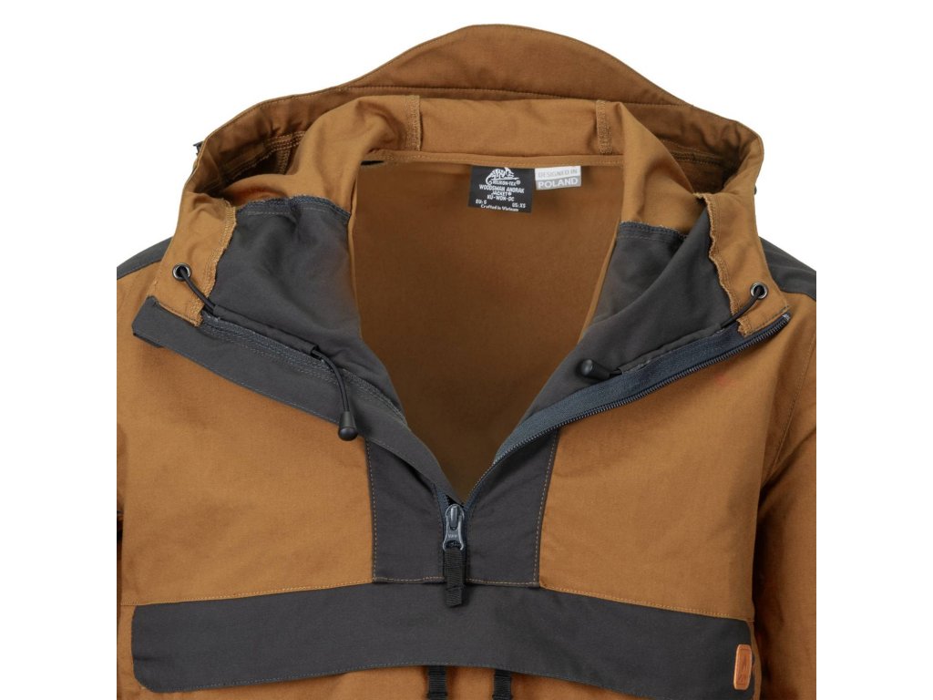 Bunda přes hlavu neboli Woodsman Anorak je vyroben z DuraCanvas® - materiálu, který je oblíben mezi bushcraftery, outdoor nadšence i prosté milovníky výletů do přírody. Přední část bundy je vyrobena z DuraCanvas® (voskované plátno - bavlna/polyester), díky kterému je odolná vůči jiskrám a poskytuje dostatečnou pevnost, tak aby nebyla snadno poškozena ostrými předměty a větvemi. Zadní část je vyrobena z tkaniny StormStretch®, která zaručuje nejen větší prodyšnost, ale také dostatečnou volnost pohybu. Celá bunda se vyznačuje velmi vysokou odolností proti větru a je částečně odolná dešti a velmi rychle schne - lze ji dále voskovat - doporučujeme FV impregnaci plátna. Woodsman Anorak je vybaven mnoha kapsami, včetně hlavní kapsy "klokanky" s integrovaným organizérem na spoustu drobností, které chcete mít u sebe. Boční části anoraku je možno otevřít pomocí zipuz až podpaží, aby se usnadnilo oblékání i vyslékání bundy. Boční zipy lze také použít jako ventilační. Kromě toho je bunda vybavena nastavitelnou kapucí s kšiltem.