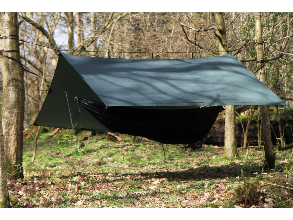 Rozměr 3x2,9m - čtvercový tvar, nekompromisní prostor, podlepené švy, 19 mohutně vyztužených vázacích ok, včetně tří ok v hřebenové linii. Je možné využít jako samostatný-ultralehký bivakovací přístřešek s možností stavby celé řady typů přístřešků nebo např. v kombinaci s hamakou.