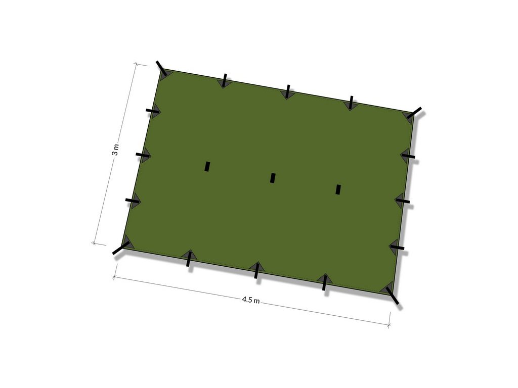 Rozměr 4,5x3 m obdelníkový tvar, nekompromisní prostor, podlepené švy, 19 mohutně vyztužených vázacích ok, včetně tří ok v hřebenové linii. Je možné využít jako samostatný-ultralehký bivakovací přístřešek s možností stavby celé řady typů přístřešků nebo např. v kombinaci s hamakou.