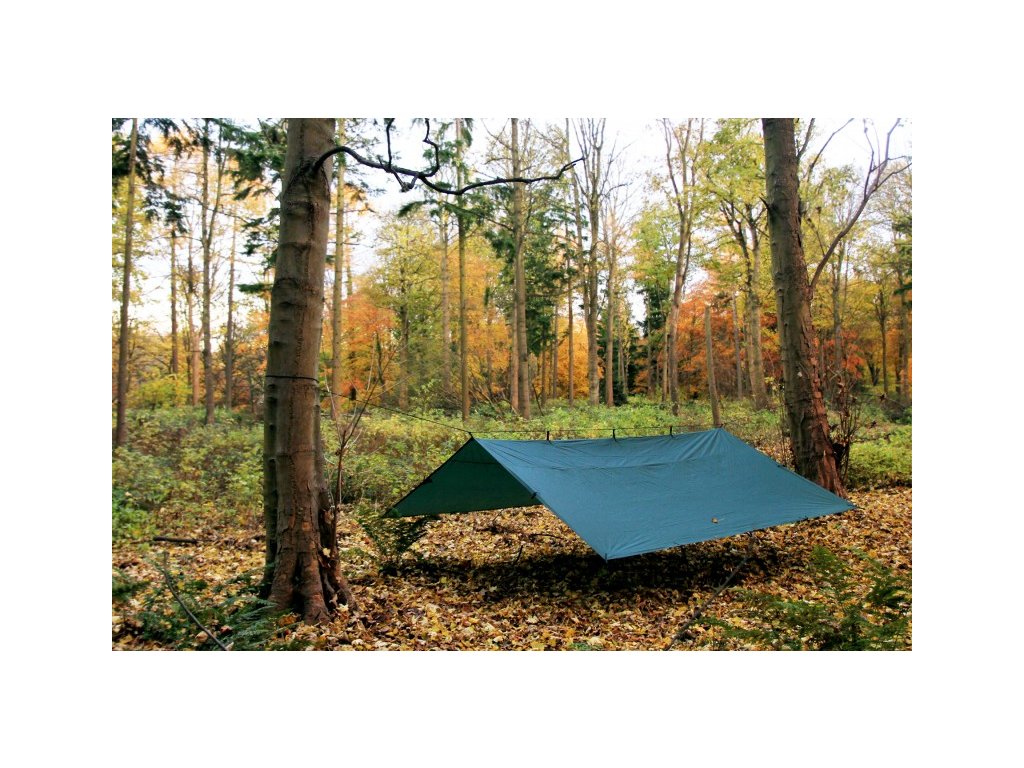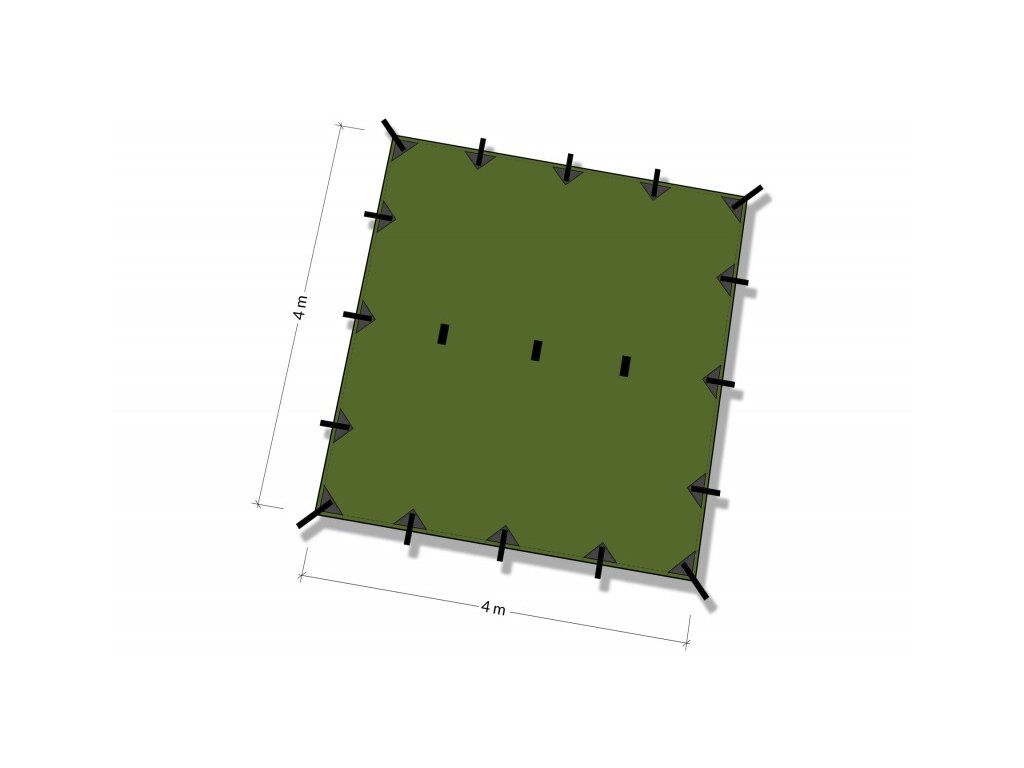 Rozměr 4x4m, podlepené švy, 19 mohutně vyztužených vázacích ok včetně tří ok v hřebenové linii. Je možné využít jako samostatný-ultralehký bivakovací přístřešek s možností stavby celé řady typů přístřešků nebo např. v kombinaci s hamakou.