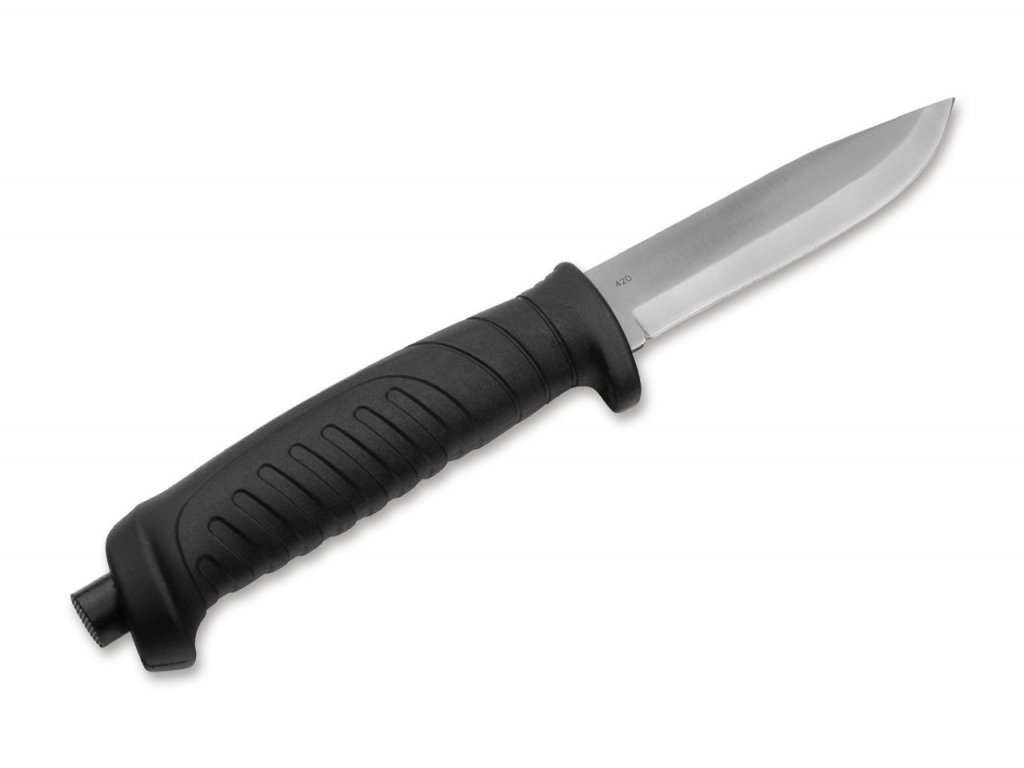 Čepel z nerezové oceli 420A je snadno brousitelná i v polních podmínkách. Nezničitelná černá plastová rukojeť je neoddělitelně spojena s čepelí pomocí procesu vstřikování, stejně jako praktický povrch na hlavici. Toto rozšiřuje rozsah použití nože o řadu praktických úkolů. Jednodílné toulcové pouzdro je vyrobeno z odolného plastu opatřeno poutkem na opasek.