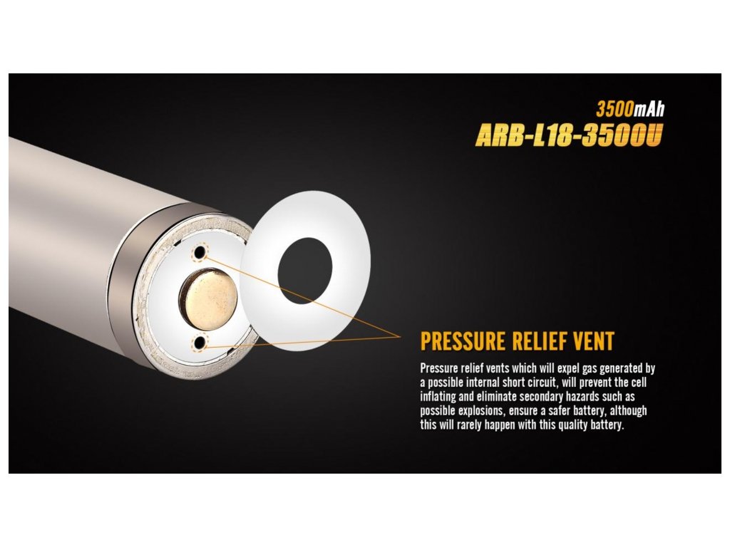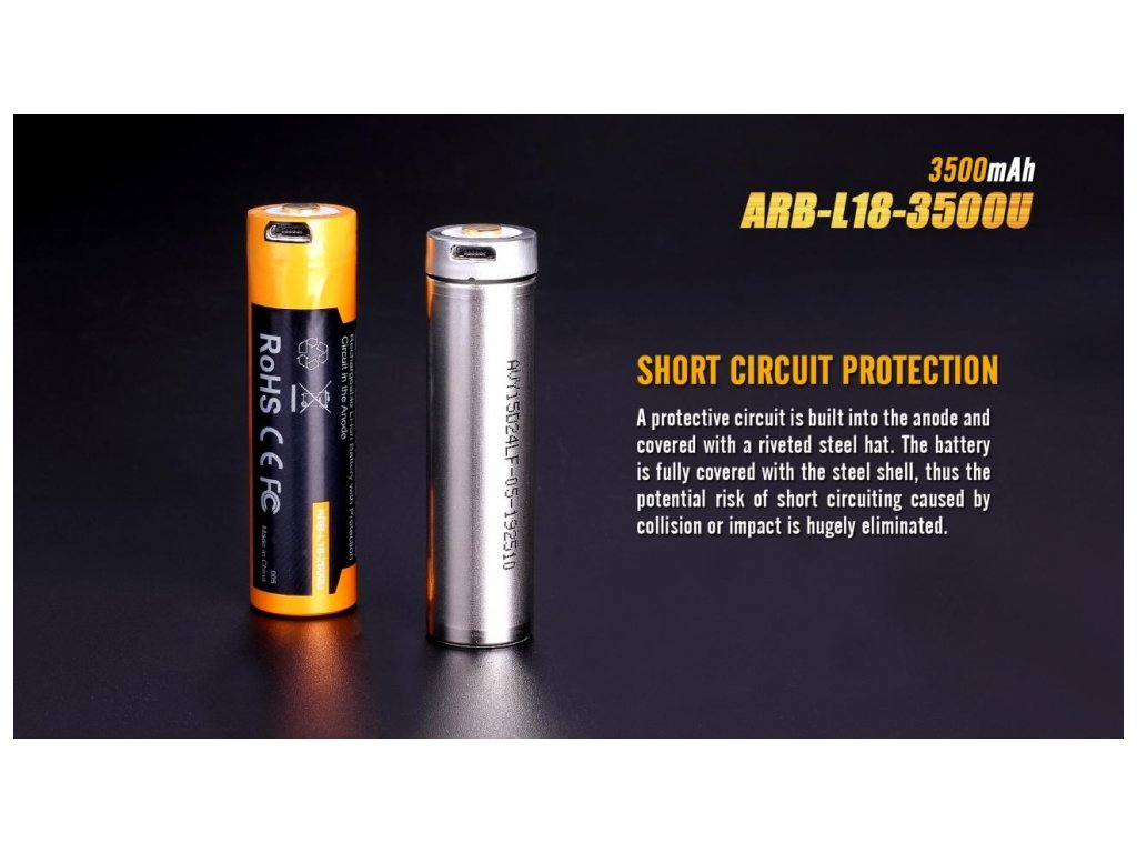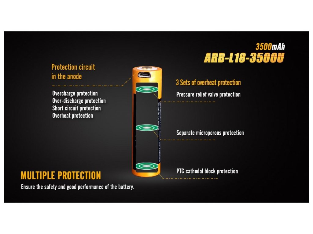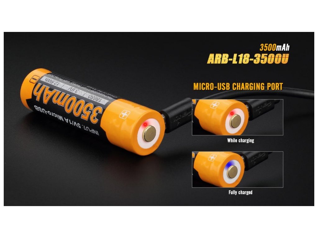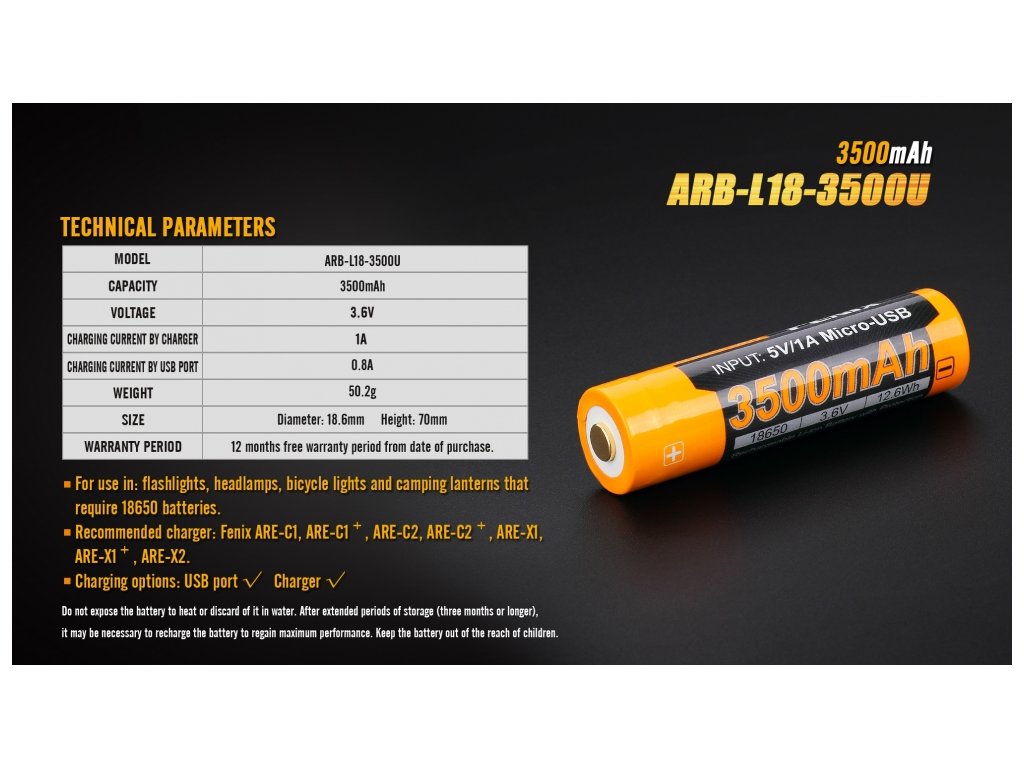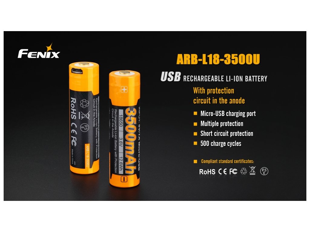 Nabíjecí baterie Fenix 18650 3500 mAh (L18-3500U) s vlastním nabíjecím mico-USB konektorem. Lze ji nabíjet připojením kabelu do micro-USB konektoru (např. z počítače či nabíječkou na mobilní telefon) tak i v klasické nabíječce. Li-ion nabíjecí baterie se vyznačují velmi vysokou kapacitou, netrpí paměťovým efektem a ani samovybíjením. Li-ion ve velikosti 18650 jsou nejlepší volbou z hlediska uchované energie vzhledem k rozměrům a váze akumulátoru.
