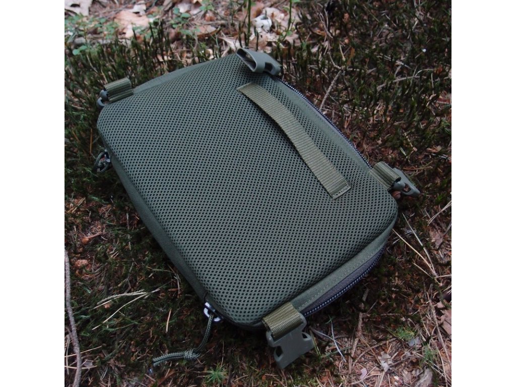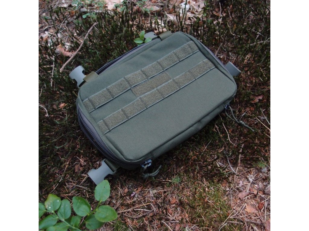Molle vazba na přední straně se protáhla až ke stranám a na vrchní straně Molle vazby je velcro panel, kde si můžete dle potřeby dát jmenovku, nášivku nebo organizér.