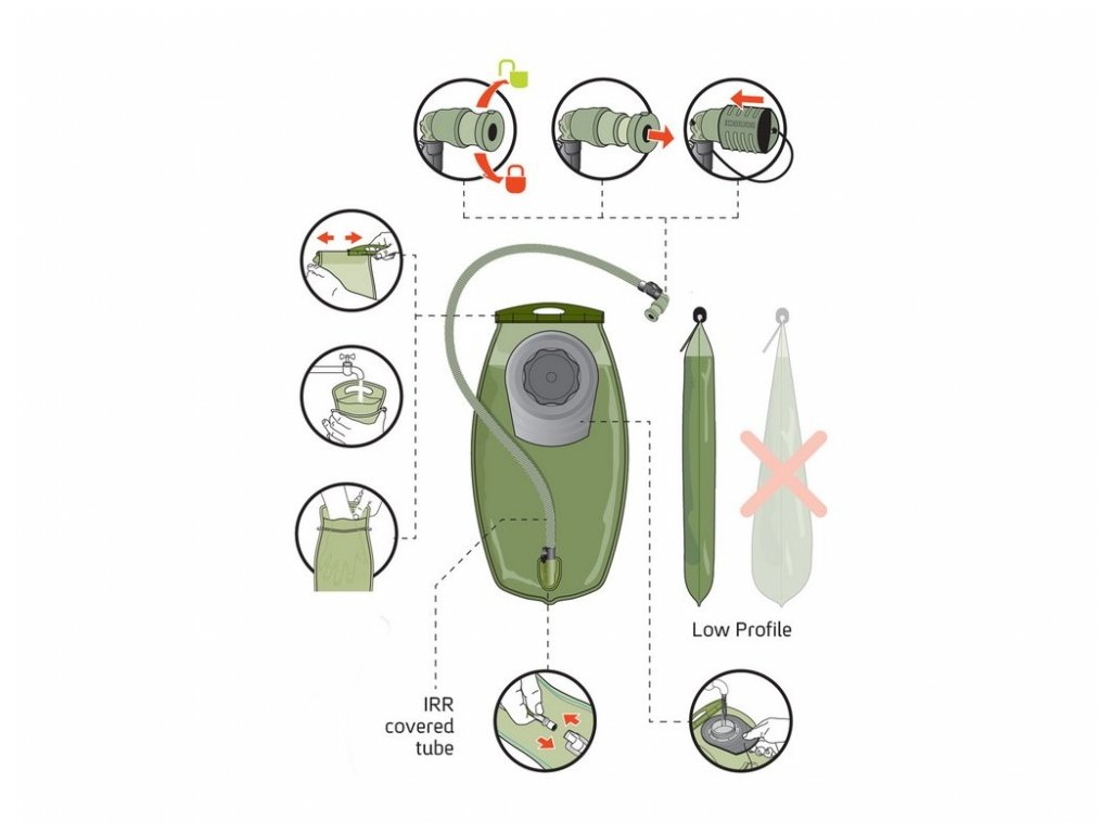 Nejpokročilejší verze oblíbené hydratace Source WXP byla navržena, aby nahradila komerční rezervoáry firmy Camelbak Tactical Line a pasovala do jejich obalu. Tento vak nepasuje do jejich Mil-Spec verze s Antidot rezervoárem.