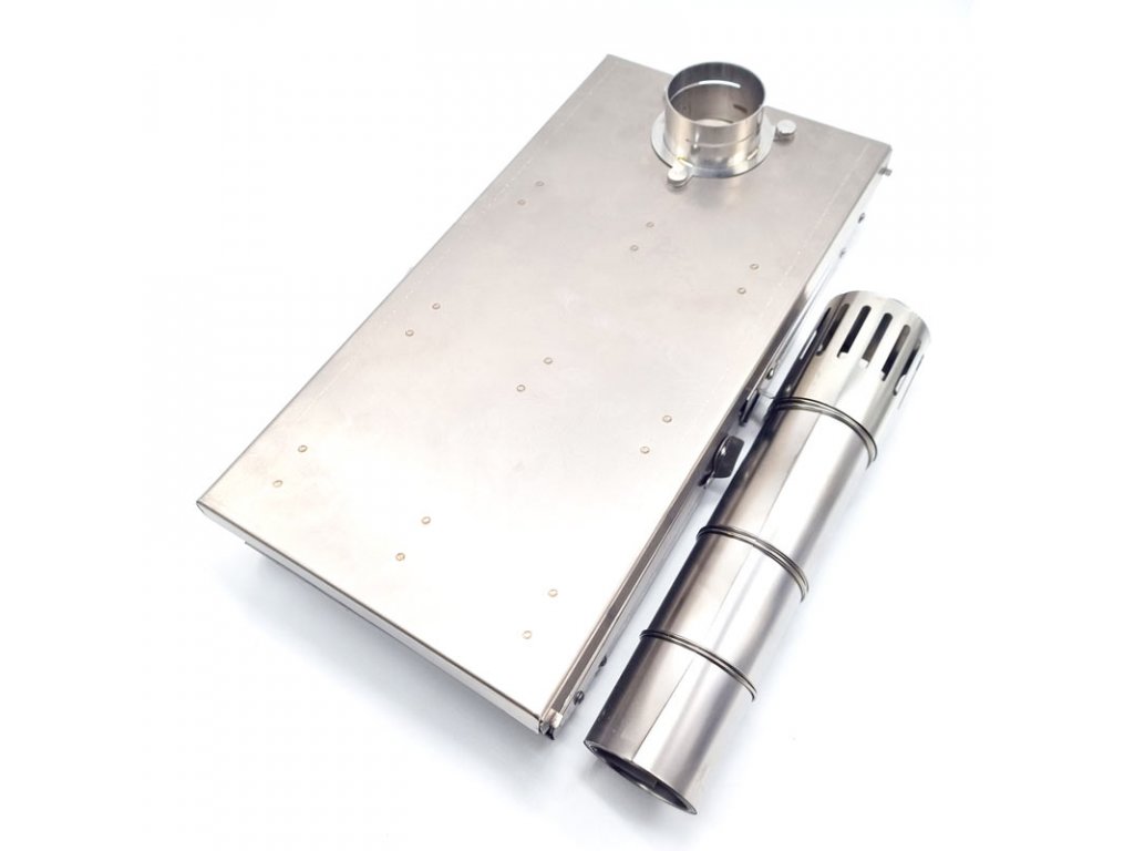 Materiál: korejský titan - slitina (plášť kamen) 1.jakost s hodnocením 1382F, nerezová ocel (části dvířek a komín) a tvrzené žáruvzdroné sklo (vyrobeno v Německu)