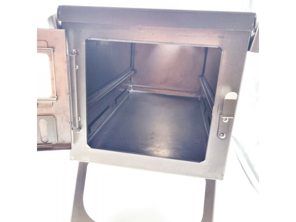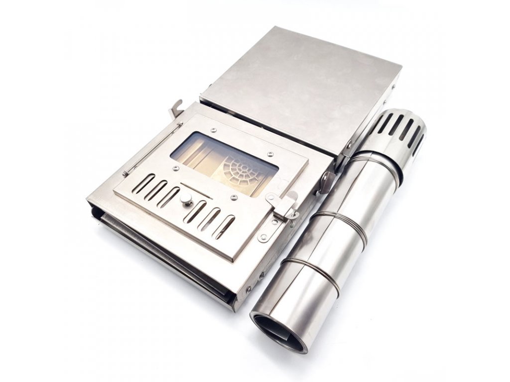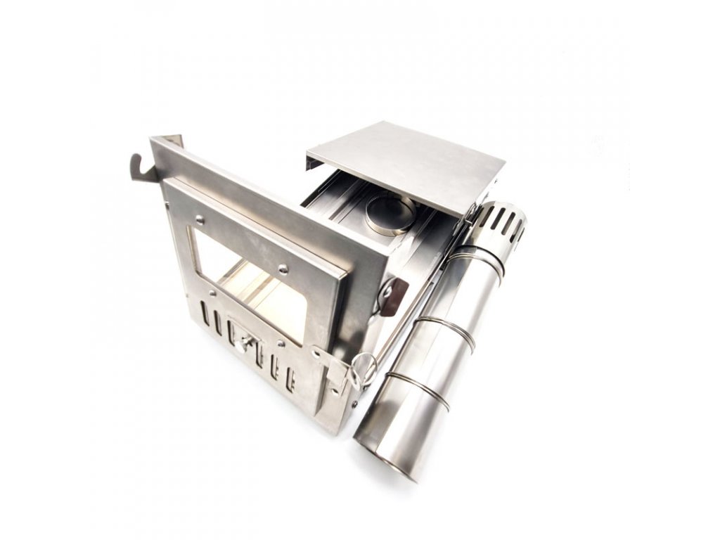 Ultralehká skládací kamna na dřevo HOT TENT WOOD Fastfold Wood STOVE jsou vyrobena z titanu, nerezové oceli a skla. Mají obdelníkový tvar, díky čemuž nabízí rovnou plochu kterou můžete použít jako sporák použitelný na ohřev konvice s vodou, smažení na pánvi nebo ohřívání pokrmů přímo na kamnech. Kamna mají dvířka pro přikládání se skleněným průzorem pro výhled na otevřený oheň zevnitř stanu a kontrolu topeniště. Dvířka mají také posuvný přívod vzduchu, takže můžete jednoduše nastavit rychlost hoření kamen.