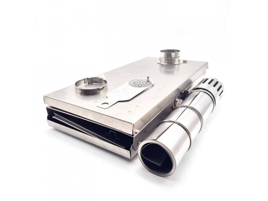 - Lapač jisker i spojovací díl komínu a kamen jsou pevné a lze je při transportu nasunout na smotaný komín čímž umožnují i jistou přepravu bez obavy o poškození komína v batohu a současně nijak neubírají ze své skladnosti