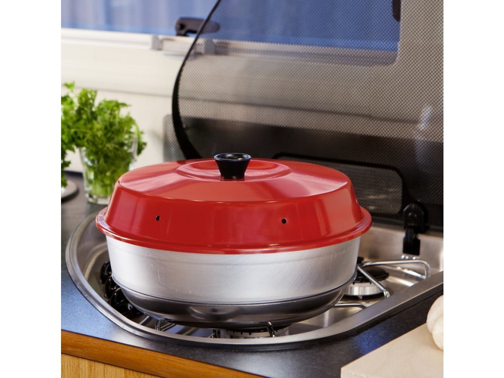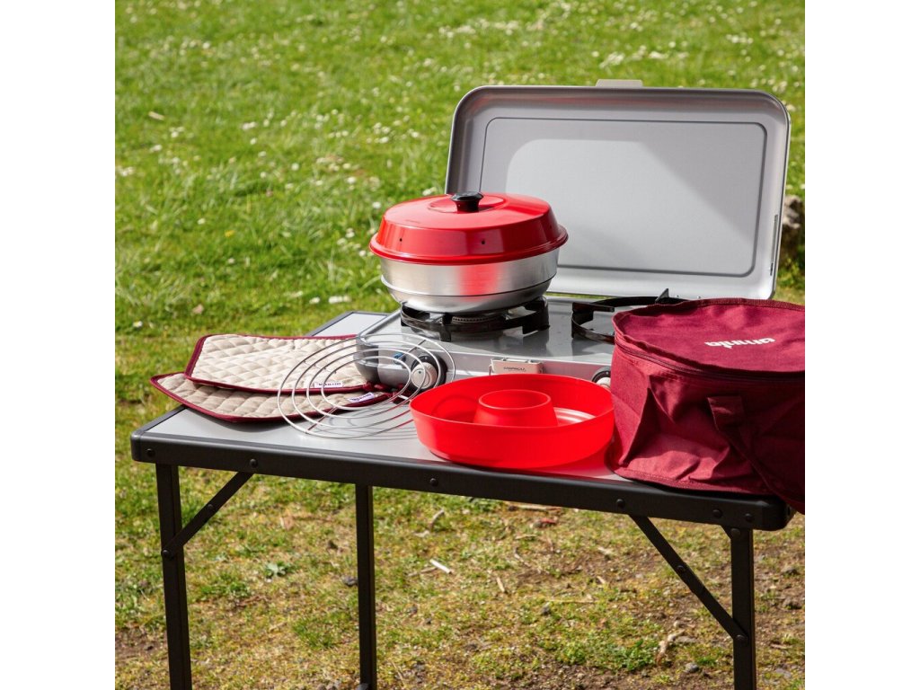 - Kempová trouba Omnia s hliníkovou pečicí formou, ocelovou pokličkou a nerezovou základnou zajišťuje rovnoměrné rozložení tepla a chrání před připálením.