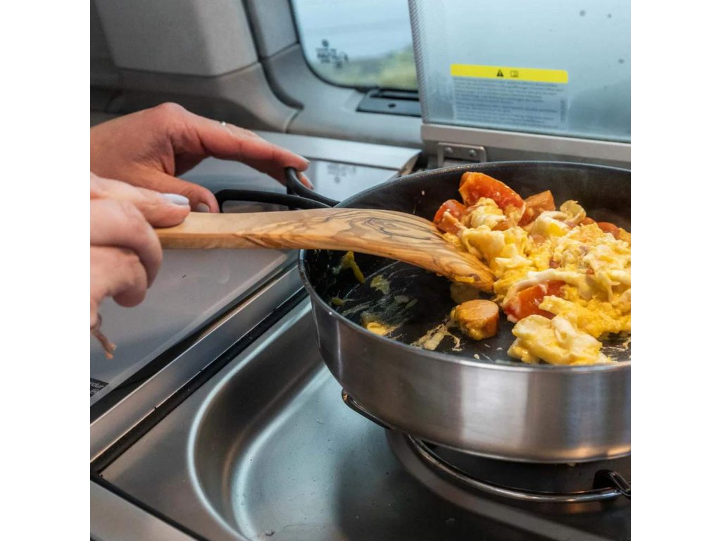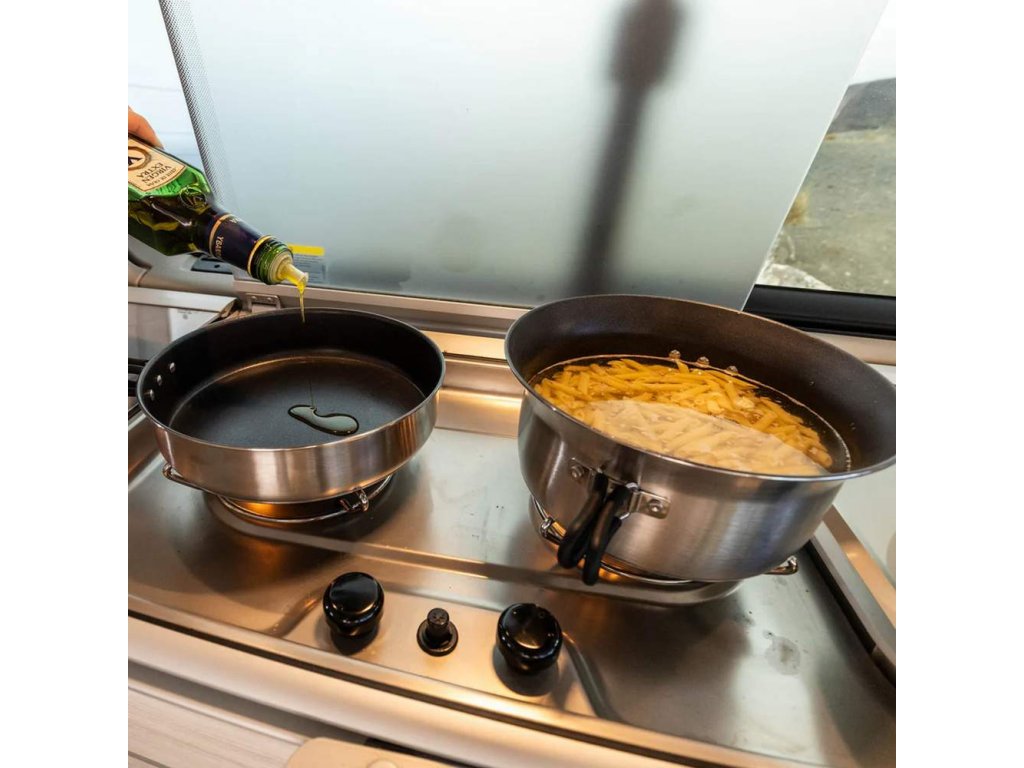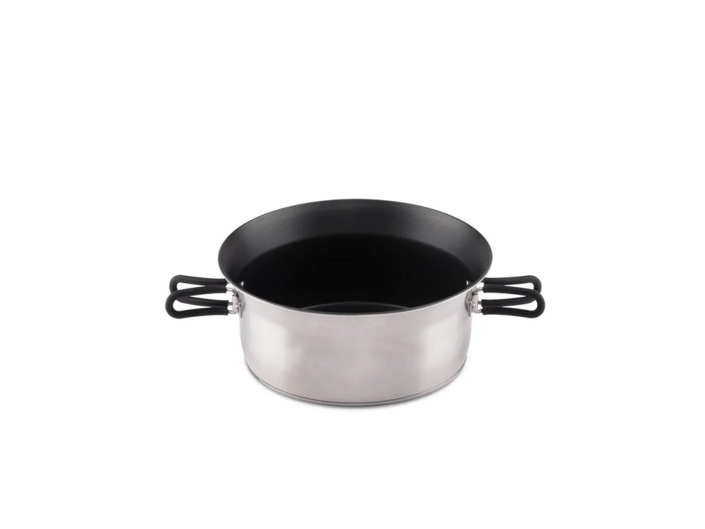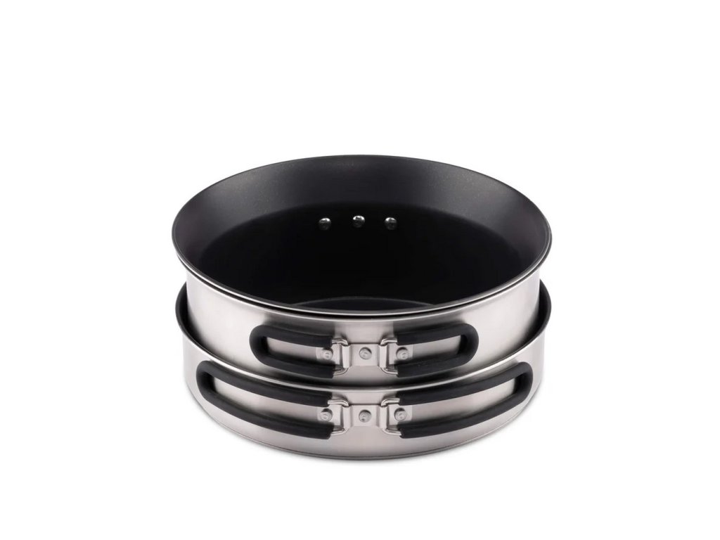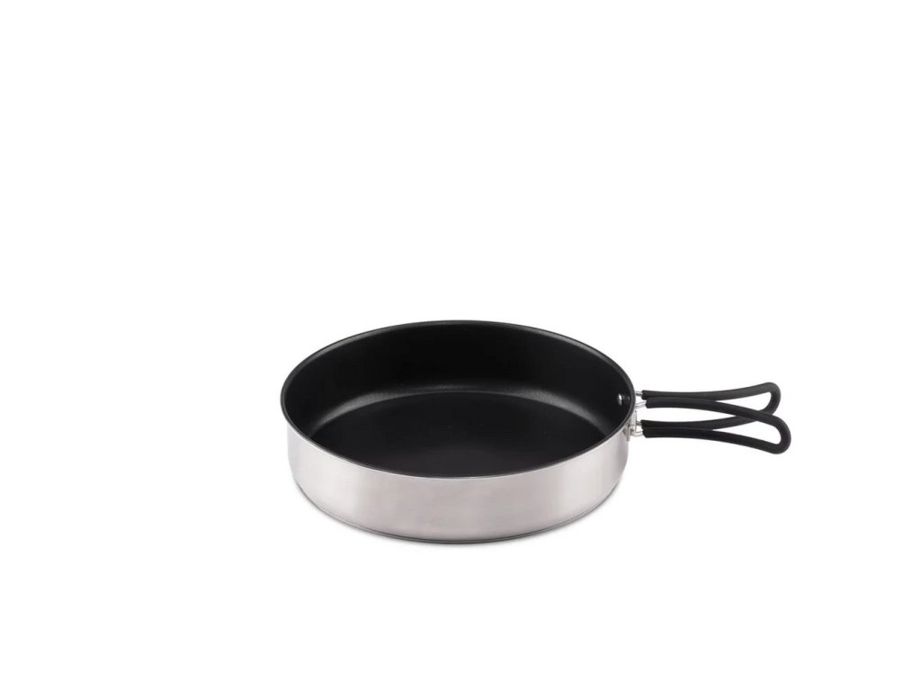 Keramický povrch zaručuje, že jídlo se nepřipálí, čištění je rychlé a spolehlivé. Skládací rukojeti s tepelnou izolací znamenají, že nepřepálíš prsty, a když balíš, všechno hezky zapadne a lze to stáhnout popruhem. A navíc – použitelná jak na otevřeném ohni či plynovém vařiči v kempu, tak i na indukční desce doma.
