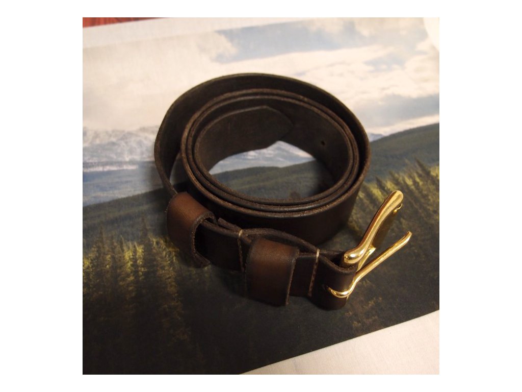 Ručně šitý opasek nejvyšší kvality z hovězí usně tloušťky 2,7 - 3,5 mm. Přezka odlitá z mosaze s doživotní trvanlivostí. K dispozici ve třech délkách.