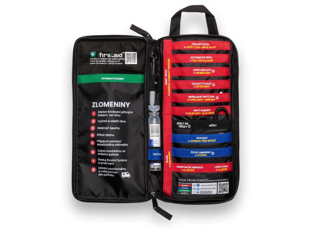 Součástí je SURVIVAL dlaha (Splint), chytrý obvaz SMART Bandage™, izotermická fólie, MARCHE a IMIST karty, nerezové nástroje, desinfekce a další nezbytnosti pro řešení zranění v terénu.