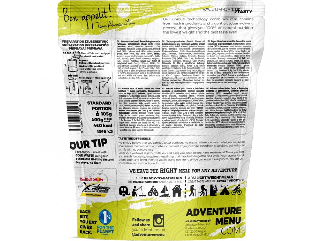 Pravá chuť Itálie v tvém batohu. Těstoviny penne z tvrdé pšenice s tradiční Boloňskou omáčkou s mletým hovězím a vepřovým masem, rajčaty, mrkví a petrželí, podlitá dobrým červeným vínem. Samozřejmě nechybí pravý Parmesan. Buon appetito.