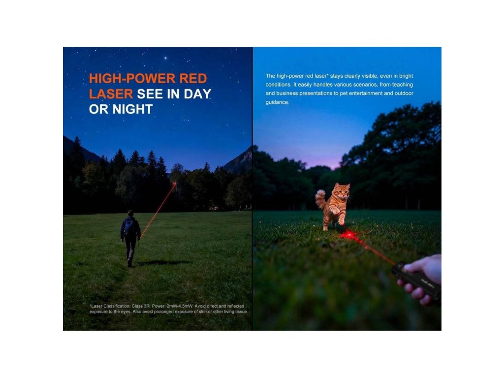 Režimy: 3 × bílé světlo, červené světlo, červené blikání,laser
