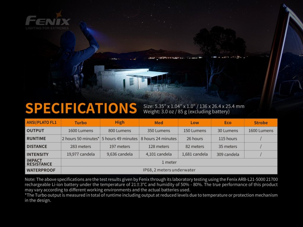 - Ke svítilně je přiložena šňůrka na zápěstí, pouzdro na opasek, akumulátor Fenix 21700 s kapacitou 5000 mAh, USB-C kabel a náhradní o-kroužky.