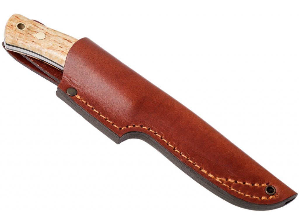 Nůž je dodáván s robustním pouzdrem vyrobeným z 3mm koňakově hnědé vyčiněné fullgrain hovězí kůže. Pouzdro je opatřeno extra širokým poutkem na opasek, otvorem pro odvod tekutiny a otvorem pro šňůru na krk.