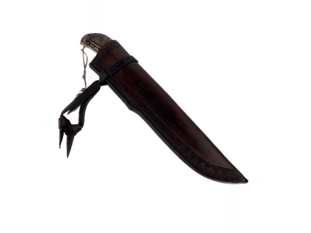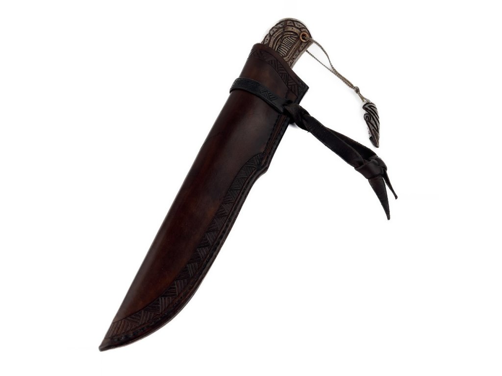 Futrál je vyroben z hovězí kůže, barvený a zdobený. Na pouzdru je kožené pouto k nošení nože.