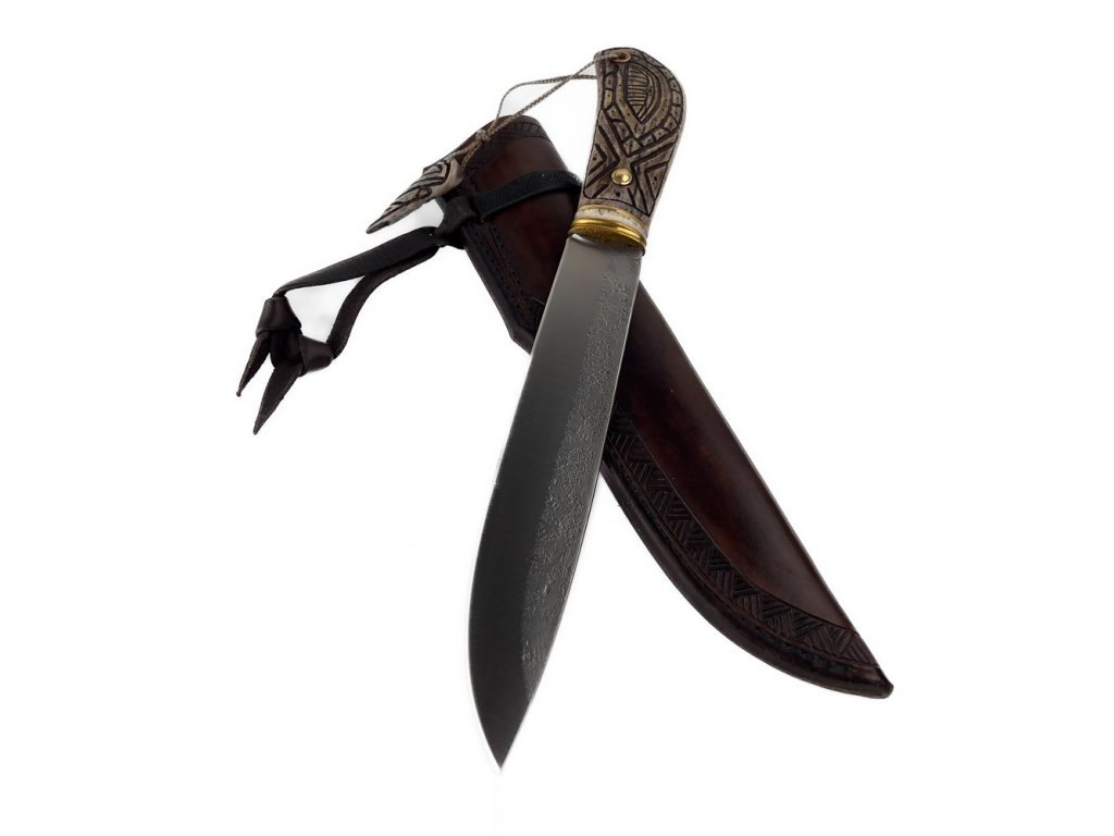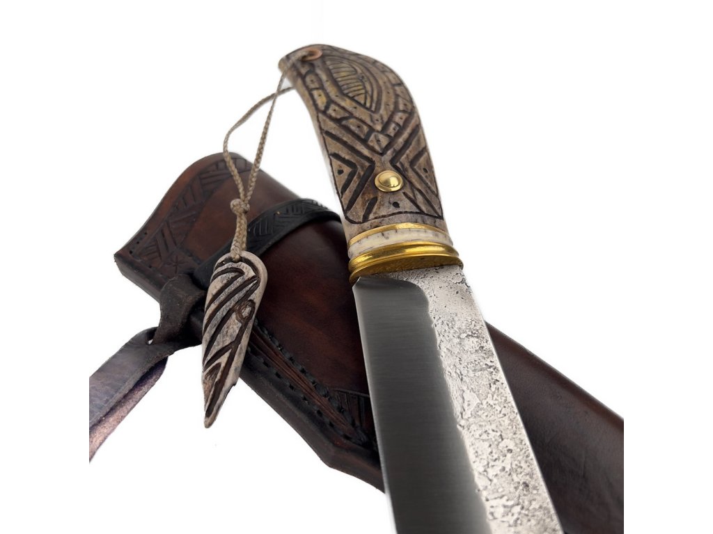 Konstrukčně je tento nůž řešen s trnem. Trn je zajištěn nýtem, který je rozklepaný přes mosaznou podložku. Kroužek (záštita) je vyroben z mosazi. Následně je nasazen další kroužek, který je z žirafí kosti. Rukojeť je zhotovena ze sobího parohu a zdobena. Celá rukojeť je lepena dvousložkovým epoxidem. Na konci rukojeti je rozklepaná bronzová trubička.