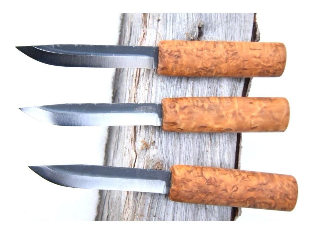 Čepele s rukojetí jsou spojeny dohromady vypálením díry do březového dřeva rozžhaveným řapem nože, který navazuje na čepel, po vytvrzení čepele je řap přesně zaklepán do otvoru (dnes se používá pro finální spojení kvalitní epoxidové lepidlo).