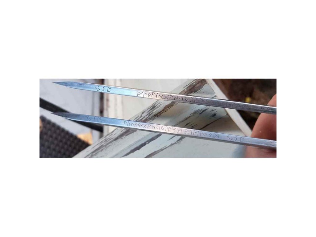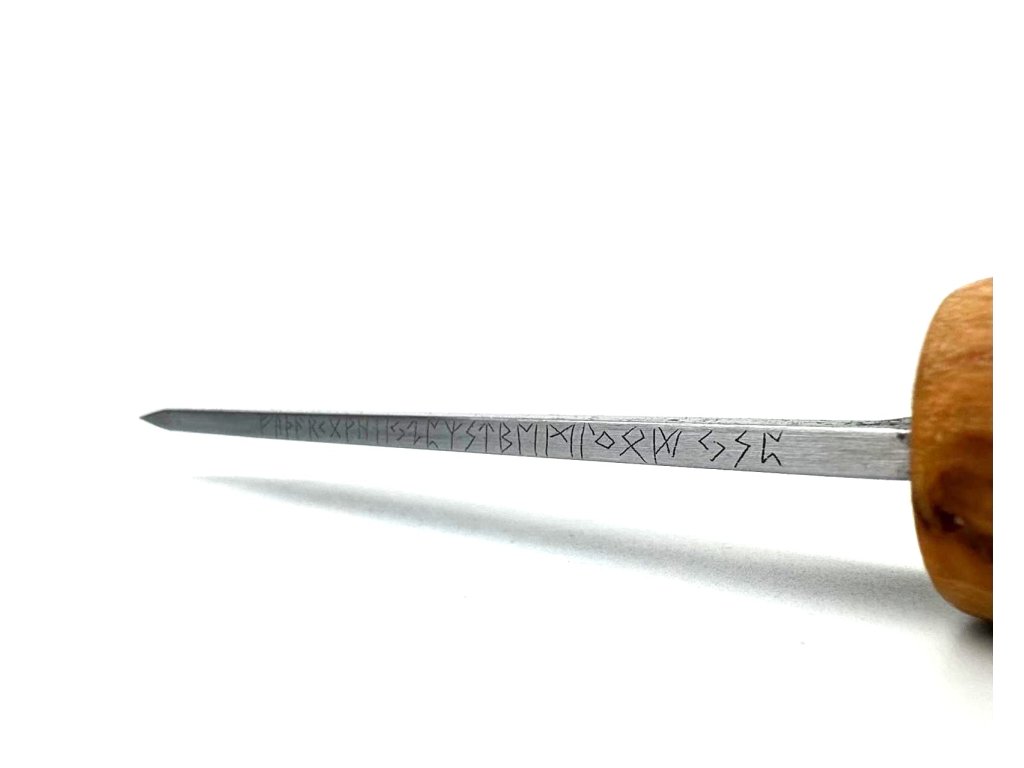 Čepel z uhhlíkové oceli Lauri 80CrV2 s dvojitým kalením (čepel 63 HRC, hřbet 50 HRC). Délka čepele je 3 "(105 mm) dlouhá a 1/8" (3,3 mm) čepel má Scandi výbrus. Skrytý řap v rukojeti má drážky a je epoxidem přilepená do rukojeti.