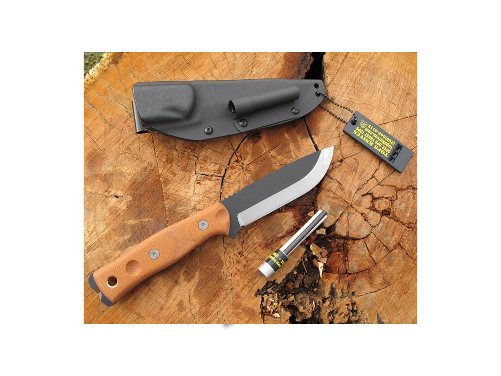 Nůž zkonstruovaný pro BUSHCRAFT jak už jeho název napovídá. Jedná se o pevný masivní nůž z uhlíkové ocele 1095 fulltangové konstrukce. Čepel nože je černěna, aby ochránila nůž před vlivy patiny a koroze. Výbrus nože je scandi = do ztracena. Rukojeť nože je z hnědé micarty, podložené fiberem. Na rukojeti je vybrán důlek určený pro použití nože jako přítlačného dřeva při technice bow-drill (rozdělání ohně třením dřev). V zadní části nože na patce je vybrání s ostrou hranou sloužící ke křesání pomocí magneziového křesadla. Křesadlo je součástí kydexového pouzdra, kde je uloženo. V rukojeti křesadla je průvlek s kovovým řetízkem na němž je navlečena nouzová píšťalka.
