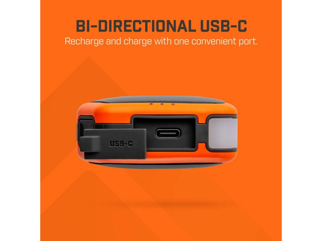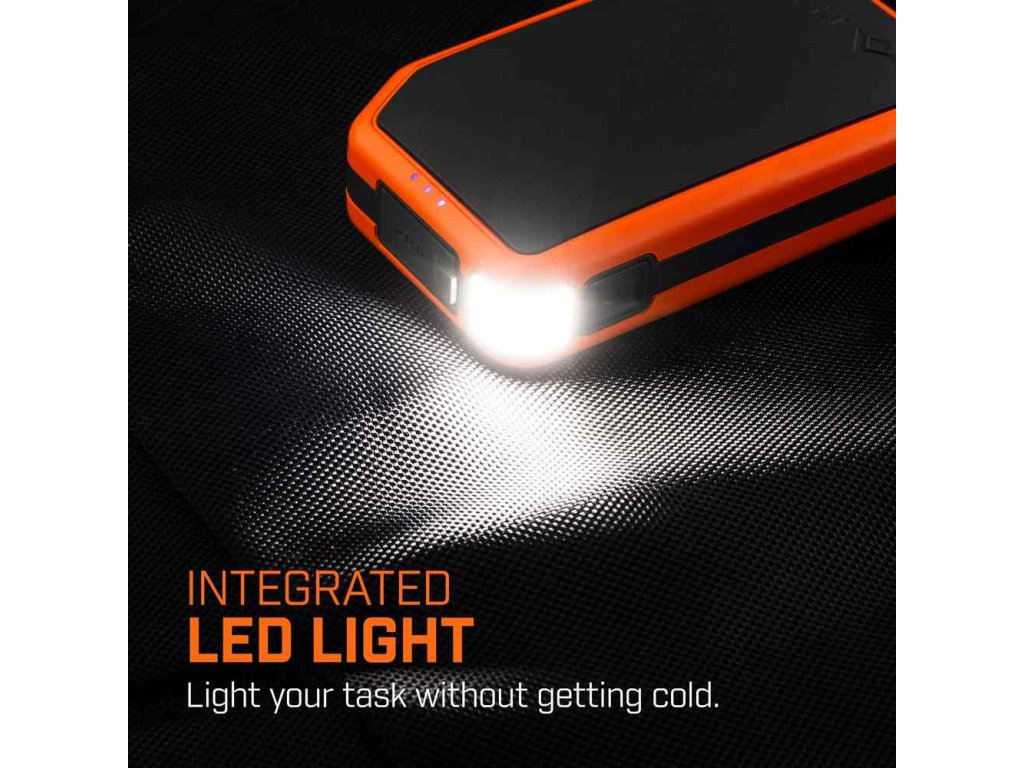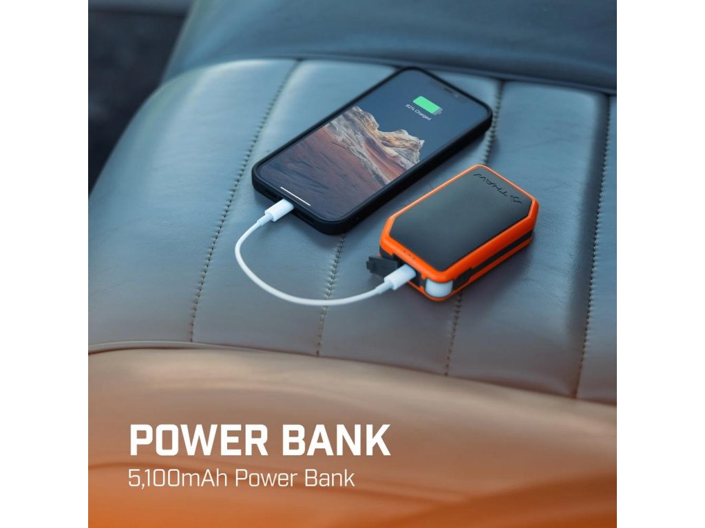 Vestavěná 5100 mAh baterie slouží zároveň jako power banka – můžeš dočerpat energii svému mobilu nebo jinému USB zařízení, kdykoli ji potřebuješ. Integrované LED světlo je ideální pro orientaci ve tmě nebo hledání klíčů v batohu.