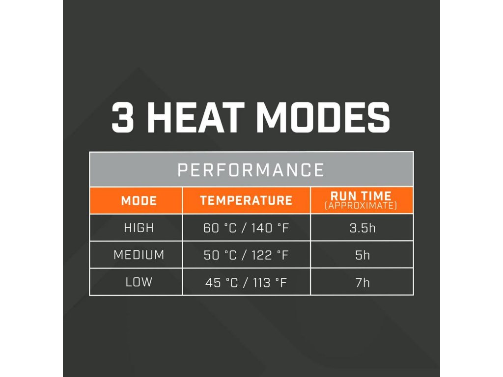 Robustní konstrukce s dvojstranným vytápěním rovnoměrně rozdává teplo na obě strany, takže se nikdy nebudou chladné prsty schovávat. Navíc má tři tepelné režimy, které ti umožní upravit výkon podle aktuální potřeby – od úsporného tepla pro dlouhé výpravy až po intenzivní hřejivost, když je venku opravdu mráz.