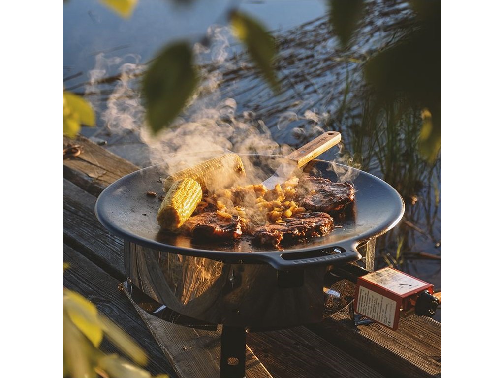 Pánev je vyrobena z jednoho kusu, za tepla lisované, oceli. Díky tomu je velice odolná a nehrozí tak její poškození při přepravě. Pánev vyniká skvělým rozvodem tepla, takže jste schopni jídlo připravovat pro větší skupinu lidí na celé ploše pánve. Pánev lze využít na všech druzích tepelných zdrojů od ohně před plynový i elektrický gril až po přímou přípravu v domácím prostředí. Pánev je tedy využitelná celoročně. Ideální pomocník pro rybáře, chataře i táborníky. V balení s praktickým ochranným pouzdrem.