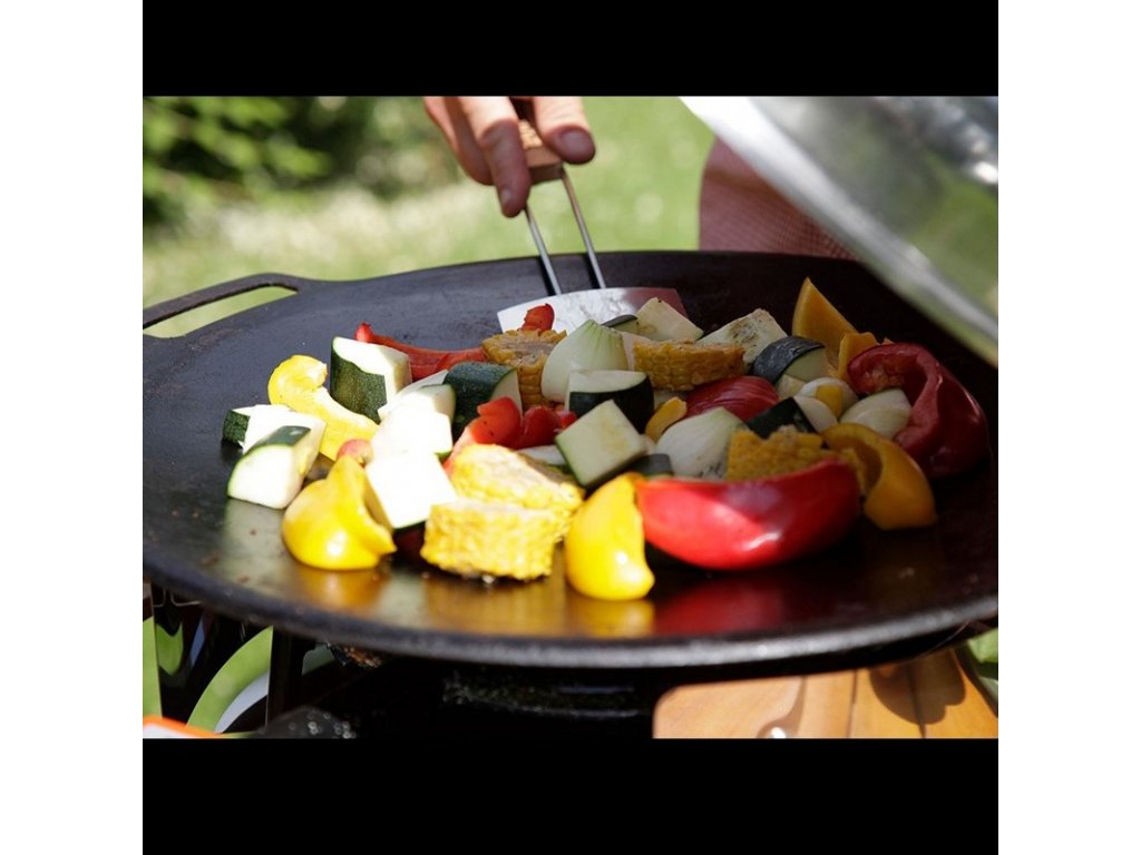 Pánev je vyrobena z jednoho kusu, za tepla lisované, oceli. Díky tomu je velice odolná a nehrozí tak její poškození při přepravě. Pánev vyniká skvělým rozvodem tepla, takže jste schopni jídlo připravovat pro větší skupinu lidí na celé ploše pánve. Pánev lze využít na všech druzích tepelných zdrojů od ohně před plynový i elektrický gril až po přímou přípravu v domácím prostředí. Pánev je tedy využitelná celoročně. Ideální pomocník pro rybáře, chataře i táborníky. V balení s praktickým ochranným pouzdrem.