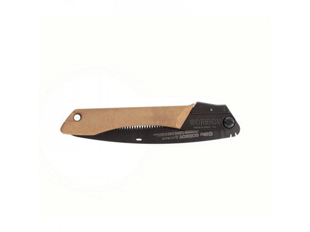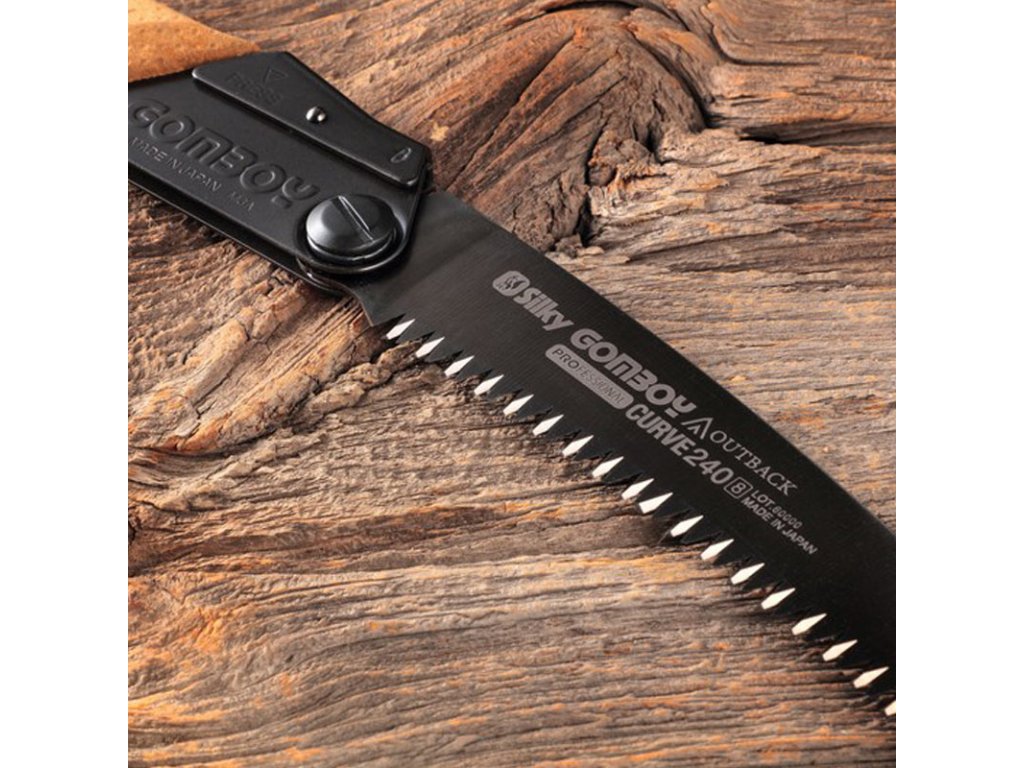 Silky Gomboy Outback Edition má 240 mm dlouhý, zahnutý pilový list s hustým ozubením (8 zubů na 30 mm délku listu), který je ideální pro řezání čerstvého i suchého dřeva a kostí. Čepel se zakřiveným profilem, na rozdíl od přímých pil, zrychluje řezání a zvyšuje efektivitu práce až o 15-20%. Klenutý tvar také zabraňuje vypadnutí pily z řezu a usnadňuje řezání větví nad úrovní ramen.