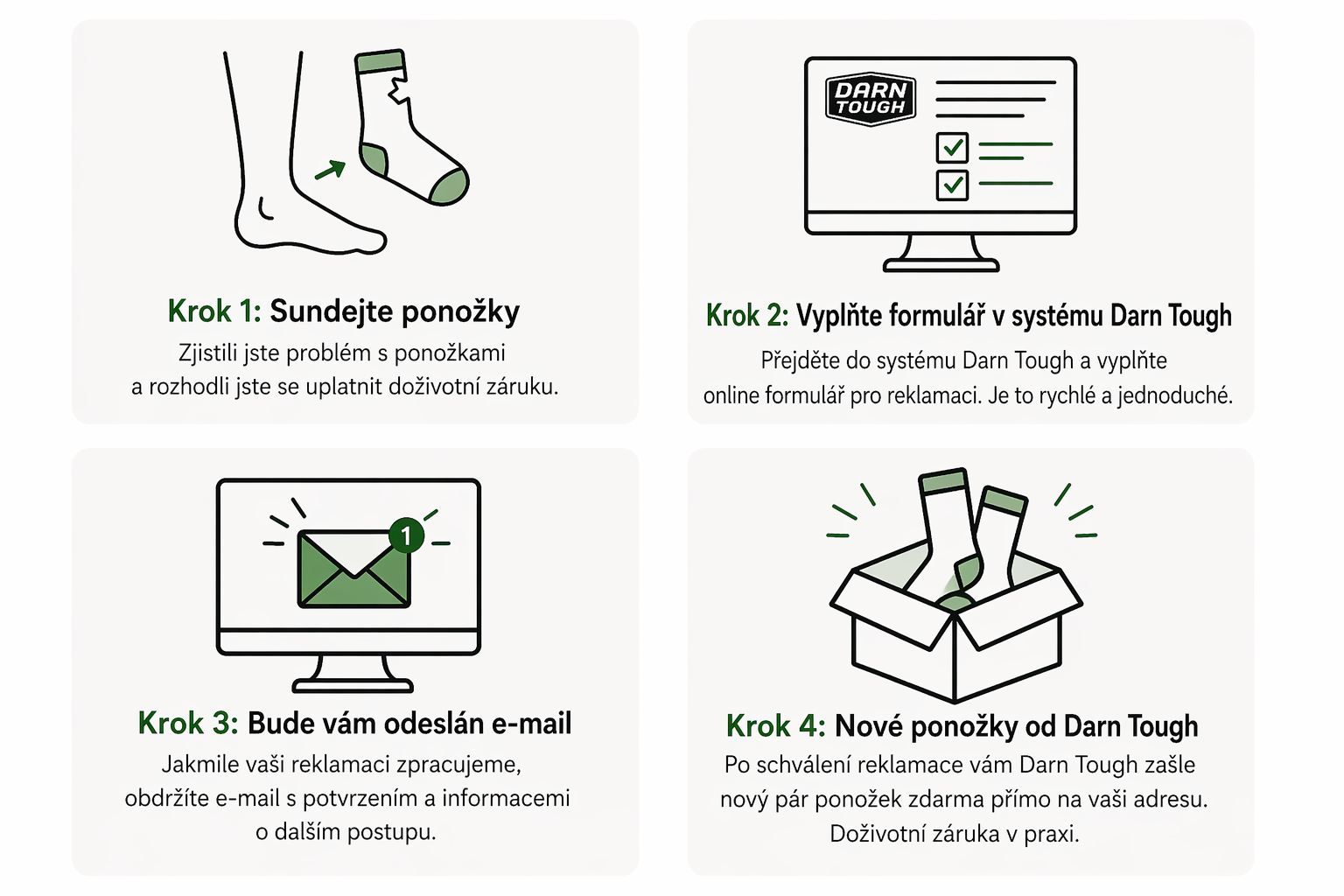 Záruční proces Darn Tough je snadný... stačí 4 kroky a nové ponožky s doživotní zárukou doručíme zdarma k vám.