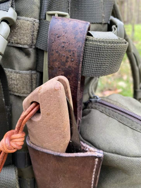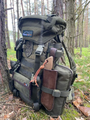 Pouzdro z naší šumperské dílny JuBö k ní sedí perfektně – ručně šité z hovězí kůže, se dvěma možnostmi zavěšení: na batoh nebo na opasek.