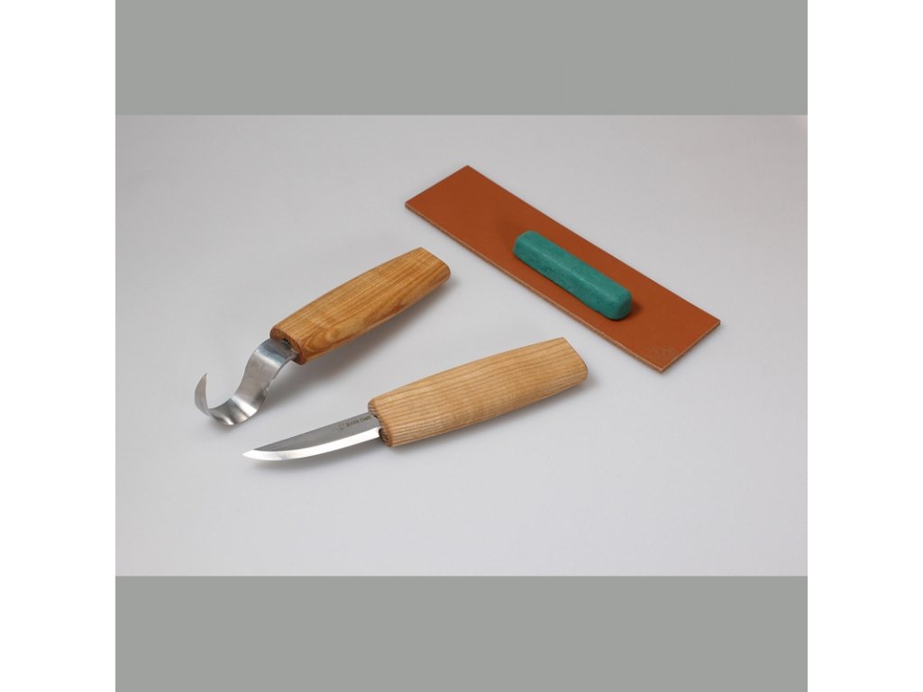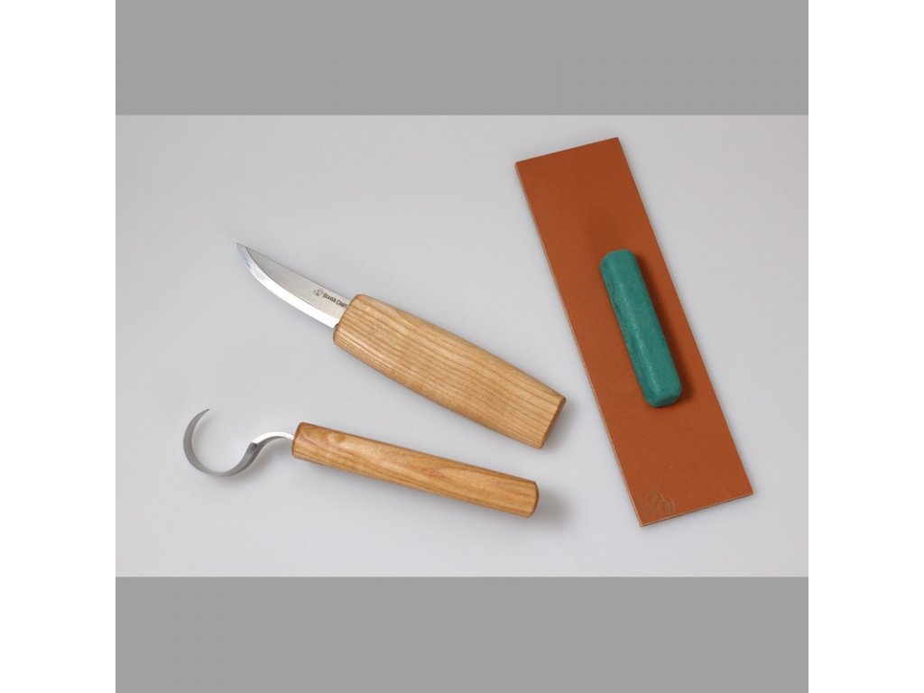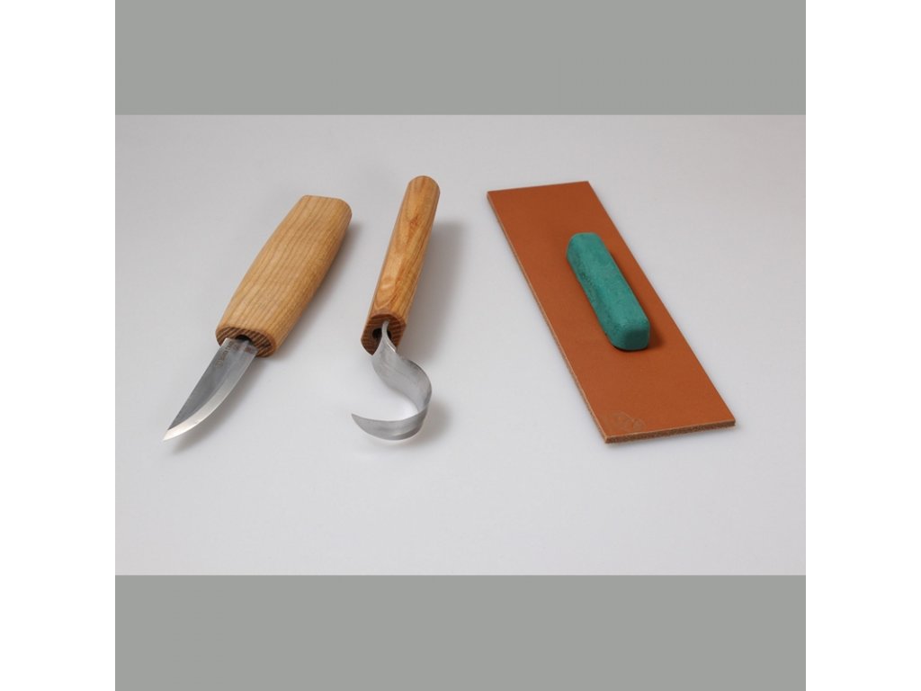 Výhodný řezbářský set, který obsahuje Řezbářský nůž BeaverCraft C1 + Lžičkový nůž BeaverCraft SK1 + kůži a leštící směs na broušení řezbářských nástrojů.