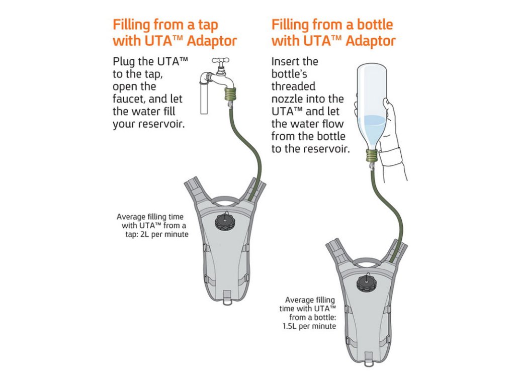 Plní se přes hadici hydratačního vaku po sundání ventilu, z pet lahve, z kohoutku! 1,5 l vody z lahve za 50 sekund! 2l vody z kohoutku za 45 sekund 3l vody z kohoutku za 1 minutu.