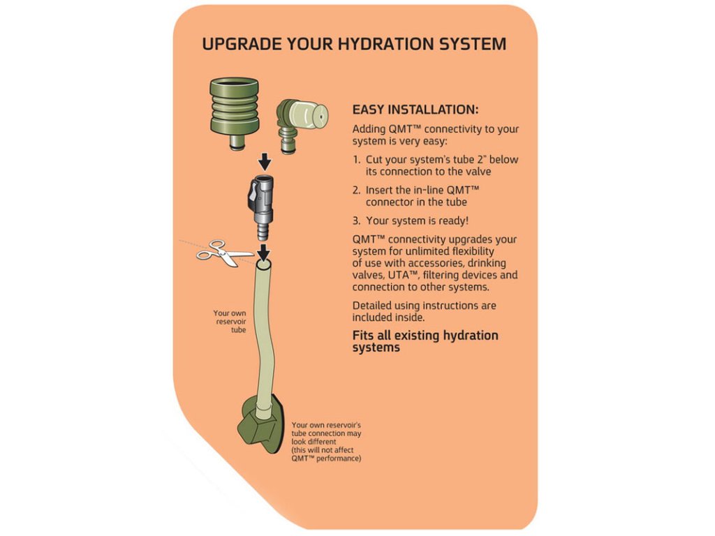 Pracuje podobně jako brčko - je třeba vodu natahovat ústy. QMT™ montážní systém umožňuje ventil snadno sundat a protáhnout hadici malými otvory či poutky výstroje.