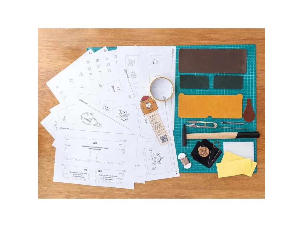 Materiály: předřezaný kožený díl, voskovaná nit, papírové šablony pro řezání/design, krém na patinu, bonus klíčenka „Beaver Tail“.
