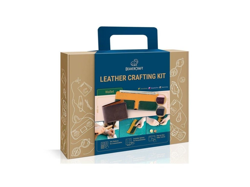 - Kompletní sada pro výrobu kožené peněženky — nástroje + materiál + video‑návod.