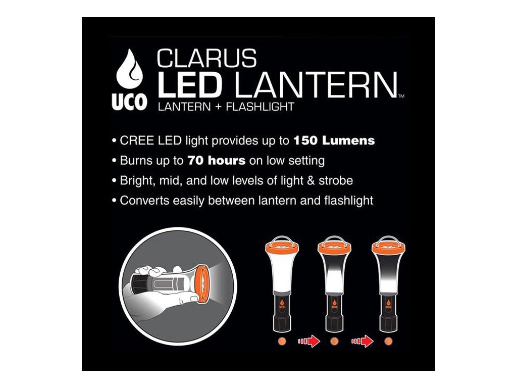 Malá a výkoná, tak by se dala nazvat svítilna a lucerna v jednom UCO Clarus Lantern. Jedná se o jednu z nejlehčích a nejuniverzálnějších svítilen na trhu. Vytvořena pro dobrodružný pobyt venku, tak aby Vám zajistila se svými 118 lumeny dostatek světla tam kde je třeba.