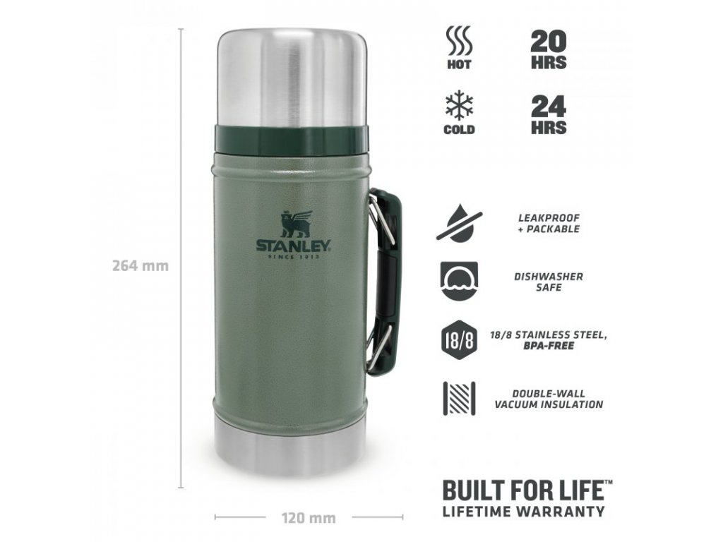 Termoska Legendary Classic značky Stanley v zelené barvě je určena na jídlo a má obsah 940ml.Při zachování rozměrů předchůdce nabízí o 200ml větší objem a lepší termální vlastnosti, kompaktnější design, rukojeť a logo.