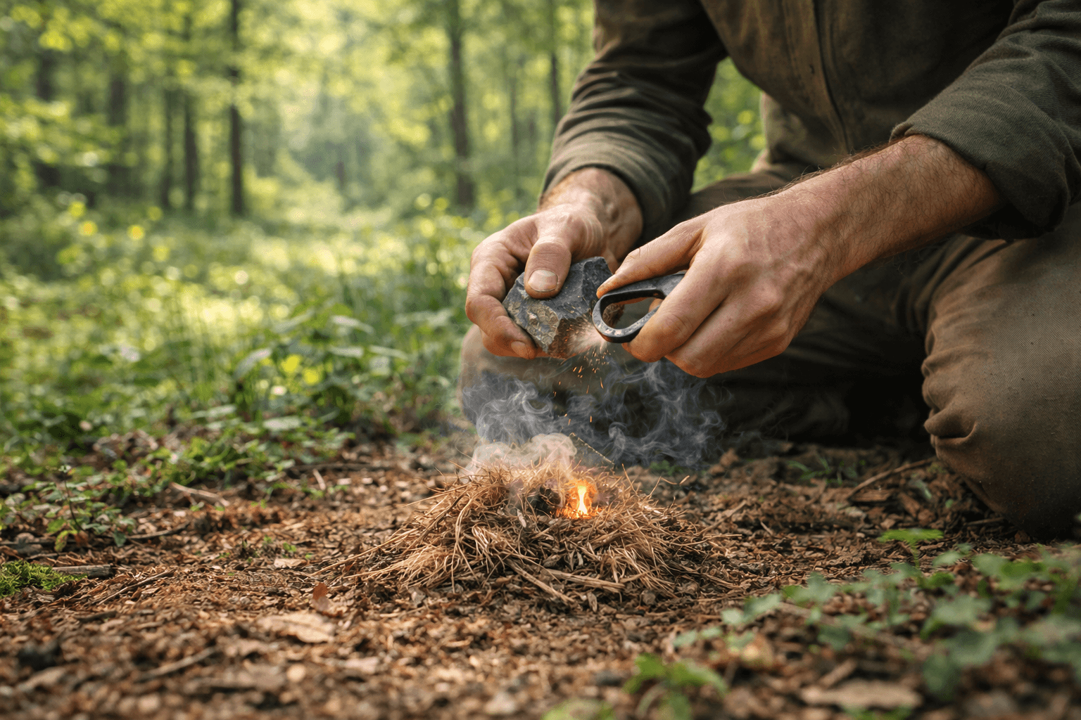 Pokud máte u sebe tvrdý kámen (například pazourek) a kus uhlíkové oceli, můžete vytvořit jiskru mechanickým úderem. Jiskra sama o sobě ale nestačí – potřebujete materiál, který ji zachytí: