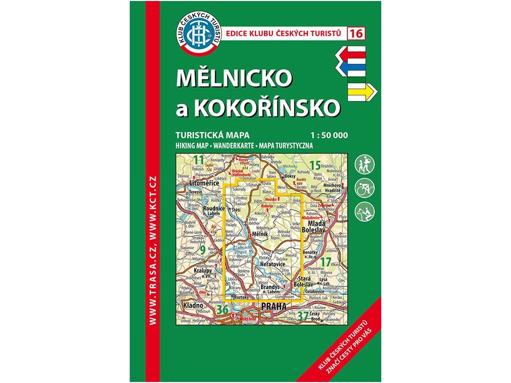Mapa č. 16 Mělnicko a Kokořínsko. Město Mělník nad soutokem Labe a Vltavy je centrem historicky významné oblasti, která na severu přechází v přírodně bohaté Kokořínsko.